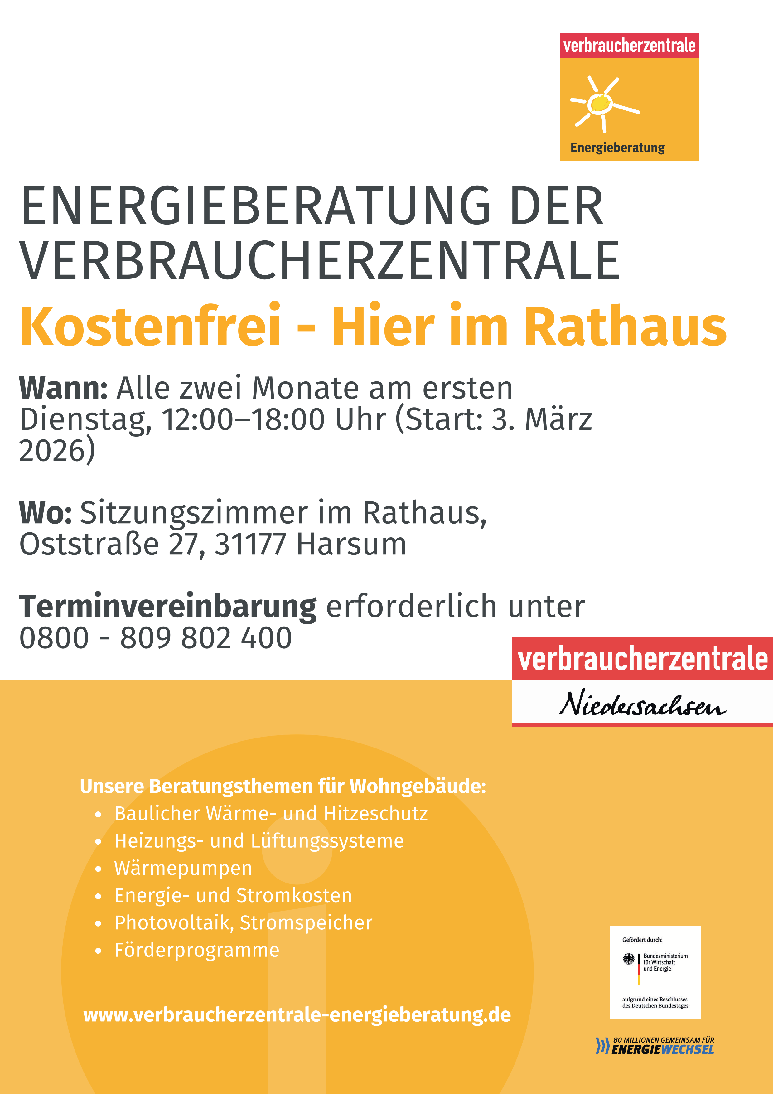 Zusammen mit der Verbraucherzentrale Niedersachsen und der Architektin und Energieberaterin Frau Eckert-Petkovic ermöglicht die Gemeinde Harsum seit Mitte 2025 eine kostenlose und persönliche Energieberatung für Privathaushalte.