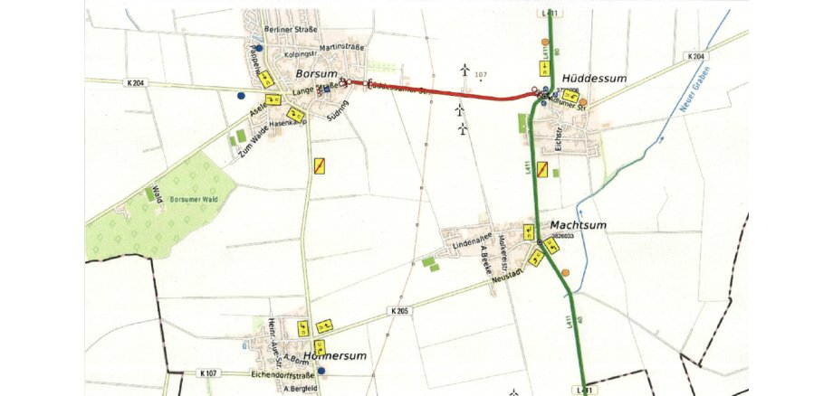 An der Ortsausfahrt Borsum in Richtung Hüddessum werden zudem die Kreuzungsbereiche zu den Straßen Südring und Rosenstraße mit erneuert. Innerhalb der Ortschaft Borsum führt eine Umleitung über die Straßen Am Hohen Turm und die Martinstraße. Die Zufahrten zu betroffenen Grundstücken innerhalb der Baustelle soll weitestgehend gewährleistet werden.