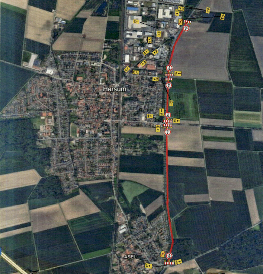 Eine Umleitung für den Radverkehr führt durch die Ortschaften Asel und Harsum und ist ausgeschildert.
