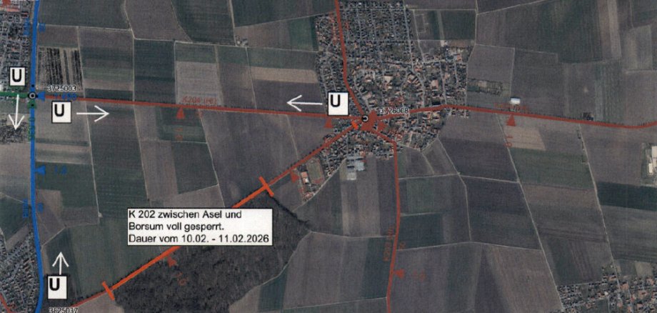 Die Straßenmeisterei Sarstedt führt am 10. und 11.02.2026 entlang der K 202 von Asel nach Borsum Baumfäll- und Rückschnittarbeiten durch. An beiden Tagen wird die Strecke daher von 09.00 bis 16.00 Uhr für den Auto-, Rad und Fußgängerverkehr voll gesperrt.